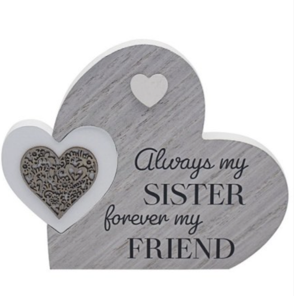 A plaque with "always my sister forever my friend" message and double heart design with cut out detailing.